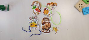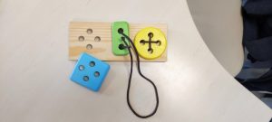 — **Тренируется пространственное мышление.** Шнурок можно продеть сверху вниз, снизу вверх, крест-накрест, вокруг детали. Ребенок осваивает понятия «над», «под», «через», «вокруг».